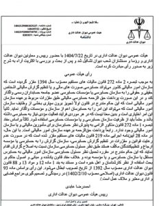 هیأت عمومی دیوان عدالت اداری در تاریخ ۱۴۰۴/۷/۲۲ با حضور رئیس و معاونین دیوان عدالت اداری و رؤسا و مستشاران شعب دیوان تشکیل شد و پس از بحث و بررسی با اکثریت آراء به شرح زیر به صدور رأی مبادرت کرده است.