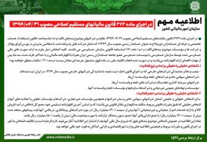 در اجراي ماده (272) قانون مالیاتهای مستقيم اصلاحي مصوب 1394/04/31، علاوه بر شركتهاي موضوع بندهاي (الف) و (د) ماده واحده «قانون استفاده از خدمات تخصصي و حرفه اي حسابداران ذیصلاح به عنوان حسابدار رسمي مصوب سال 1372» که شامل شركتهاي پذیرفته شده يا متقاضي پذيرش در بورس اوراق بهادار و شركتها و مؤسسات موضوع بندهاي (الف) و (ب) ماده (7) اساسنامه قانوني سازمان حسابرسي می باشند، کلیه اشخاص ذیل ملزم به ارایه صورتهای مالی حسابرسی شده توسط سازمان حسابرسی یا موسسات حسابرسی عضو جامعه حسابداران رسمی ایران همراه با اظهارنامه مالیاتی و یا حداکثر ظرف مدت سه ماه پس از مهلت انقضای ارایه اظهارنامه می باشند و درصورت عدم انجام تکلیف مقرر در ماده فوق، مشمول جریمه ای معادل بیست درصد (20%) مالیات متعلق خواهند بود؛
