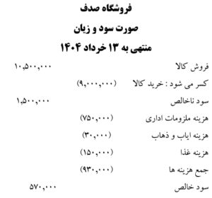 اول خرداد 1404 : فروشگاه با واریز مبلغ 5.000.000 ریال به حساب بانک با عنوان سرمایه اولیه اغاز بکار کرد .